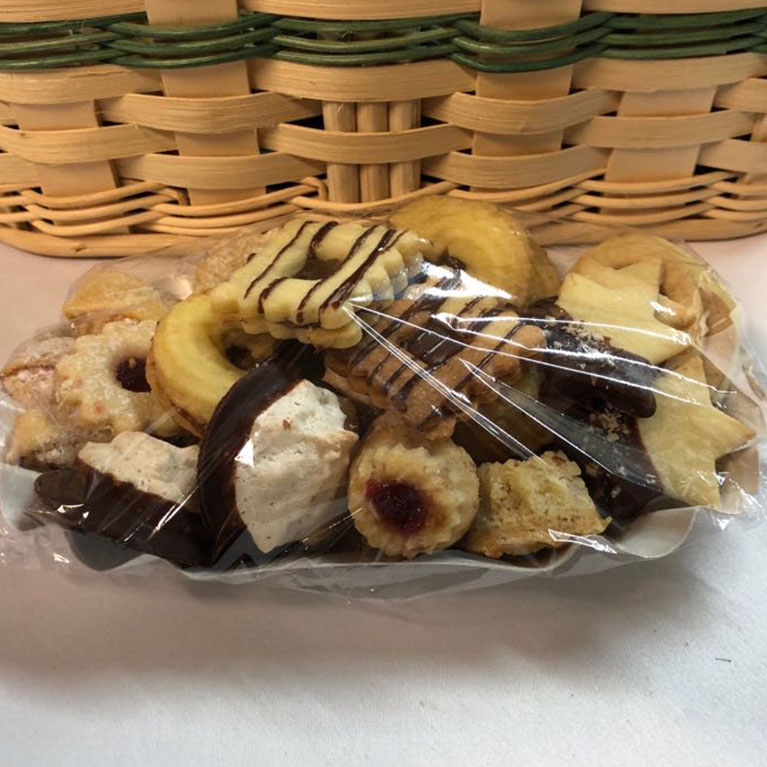 Zutaten: Mehl, Zucker, Rohzucker, Vanillezucker, Eier, Haselnüsse, Walnüsse, Lebkuchengewürz, Butter, Kochschokolade, Milchschokolade, Schokobohnen, Kokosett, Punschglasur, Zimt, Natron, Haselnusscreme, Marillenmarmelade, Ribiselmarmelade, Essig, Honig, Rama, Dörrpflaumen, Feigen, Rum, Zitrone, Nougat, Mandeln, Cornflakes, Ceres, kandierte Früchte